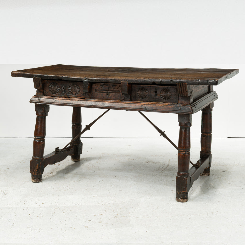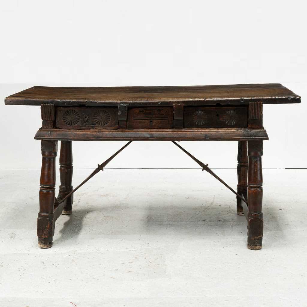 featuring a single-plank top, with three drawers carved drawers with iron hardware, and a wrought iron stretcher base and baluster turned leg