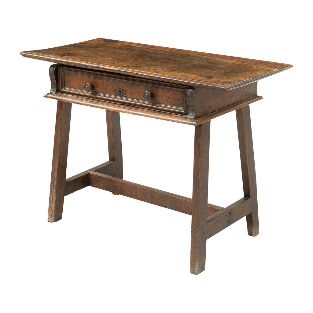 The rectangular top with moulded edge, partially replaced, above a single drawer and trestle base with stretcher
