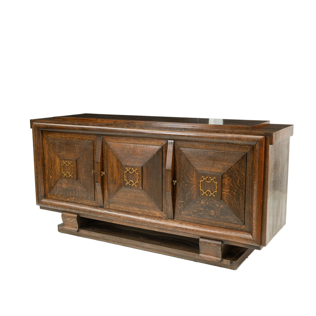 The dark oak construction features a spacious rectangular top, supported by a sophisticated facade of three cabinet doors adorned with projected moulding and a striking central brass detail.