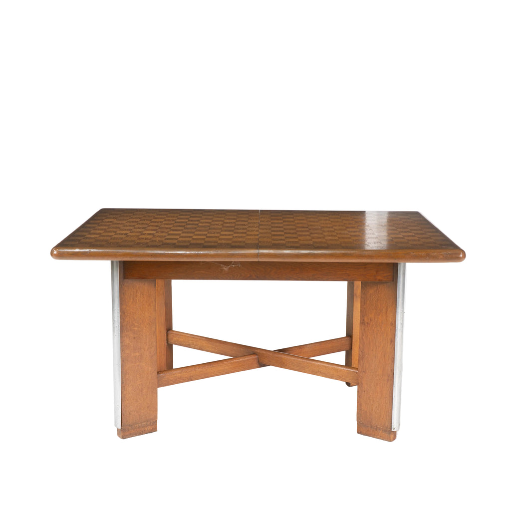 With checkerboard top above four legs with applied stainless steel detail and joined by an x stretcher, retaining its original extensiosn which are without the checkerboard finish
