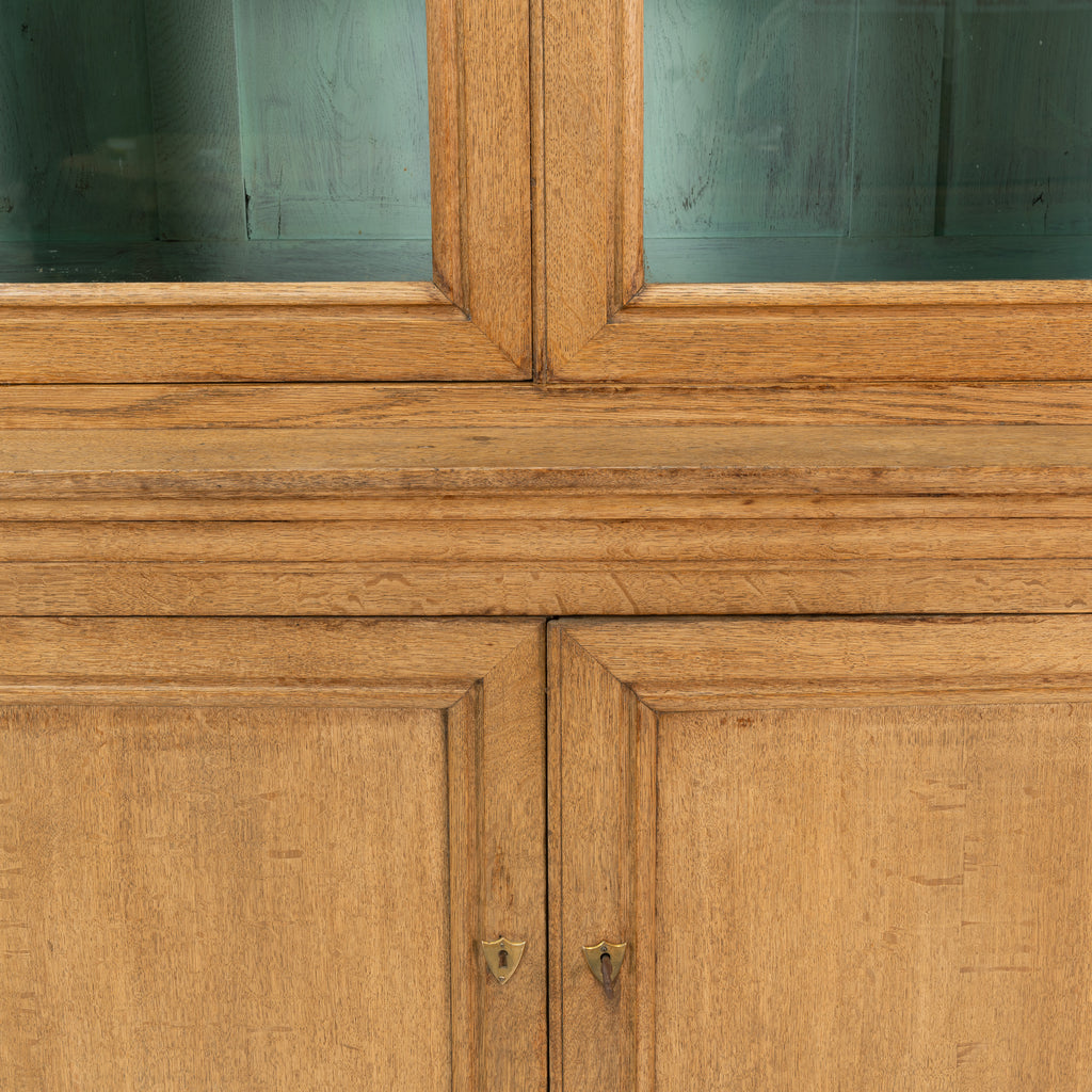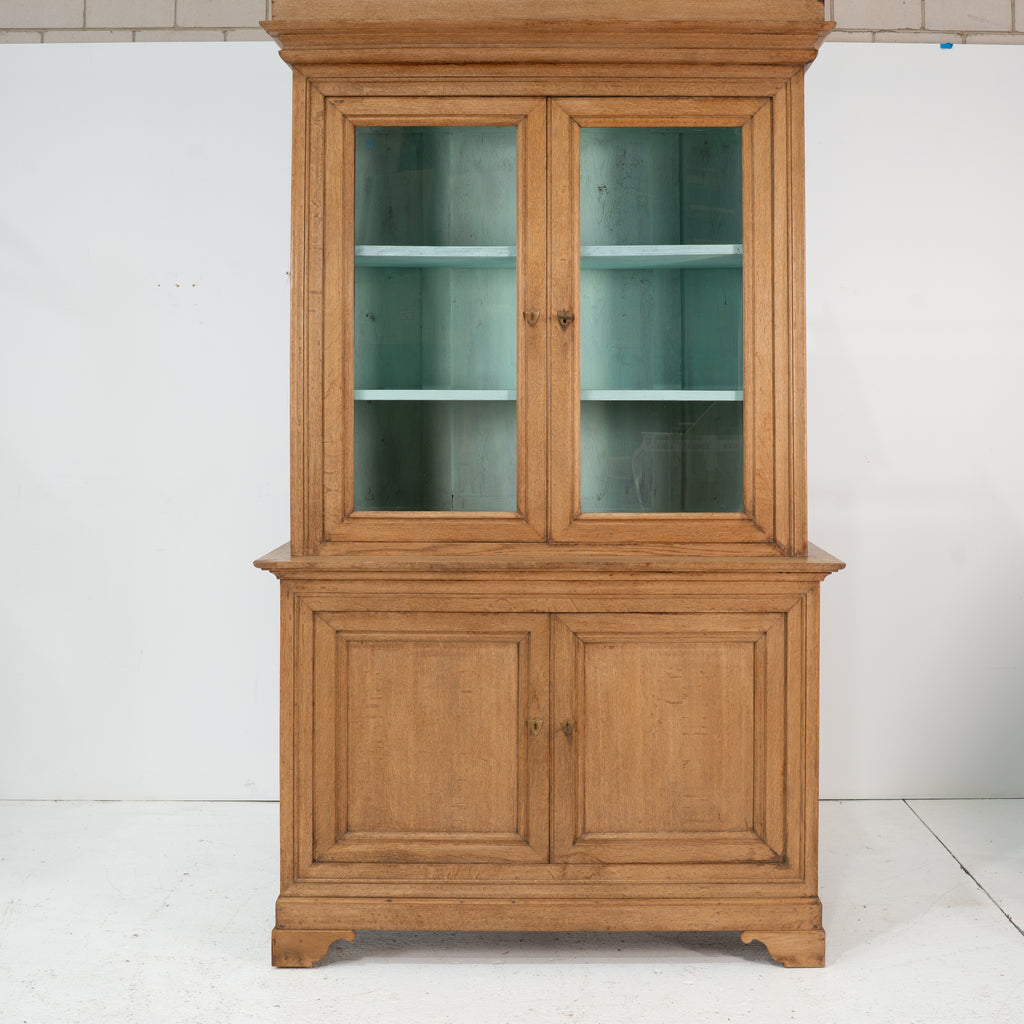 In Bleached oak, the top in with two glass doors opening to a blue painted interior above two panelled cabinet doors