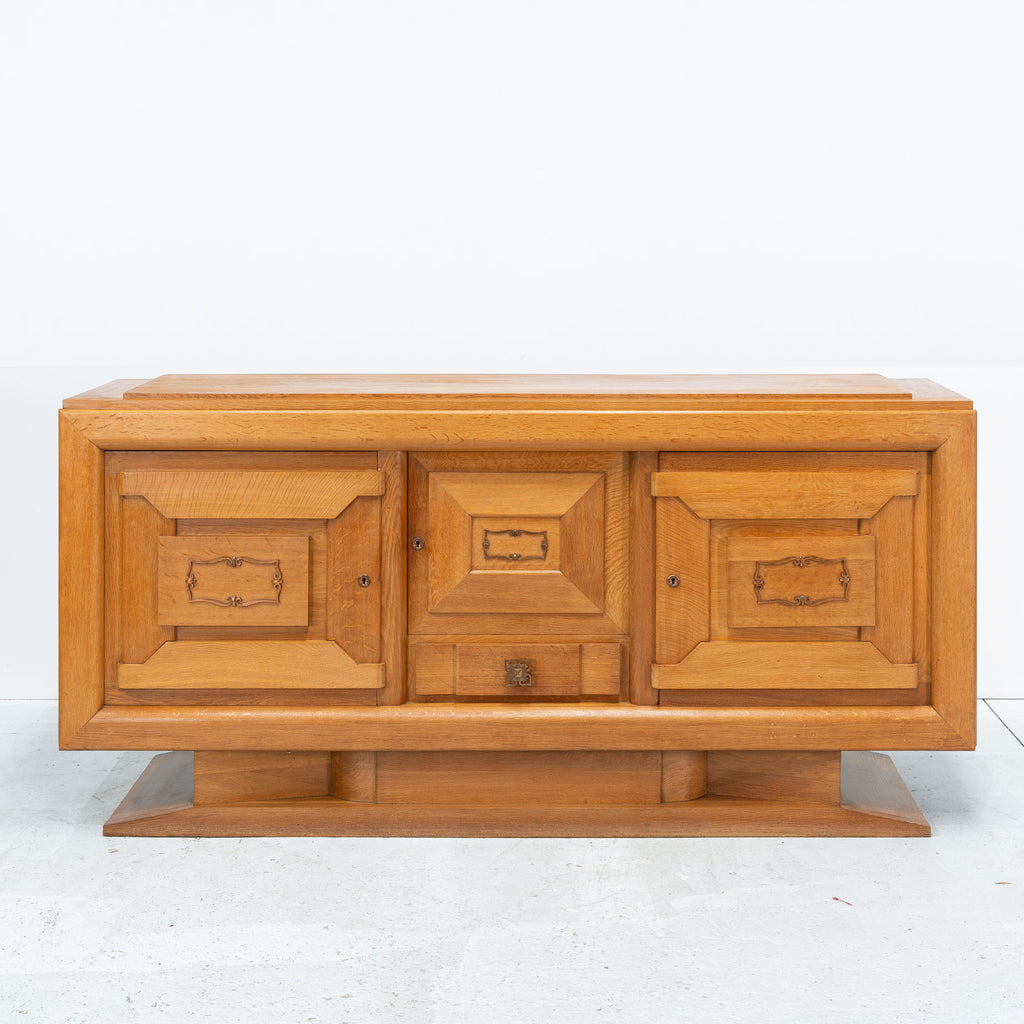 This wonderful Art Deco sideboard was crafted in Europe in the 1940s and is executed in oak wood. The sideboard offers plenty of storage space.
