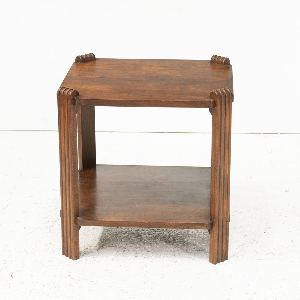 This elegant Art Deco side table showcases the refined craftsmanship of 1940s French design. Constructed from rich walnut wood, it features a distinctive two-tiered structure that combines functionality with sophisticated style