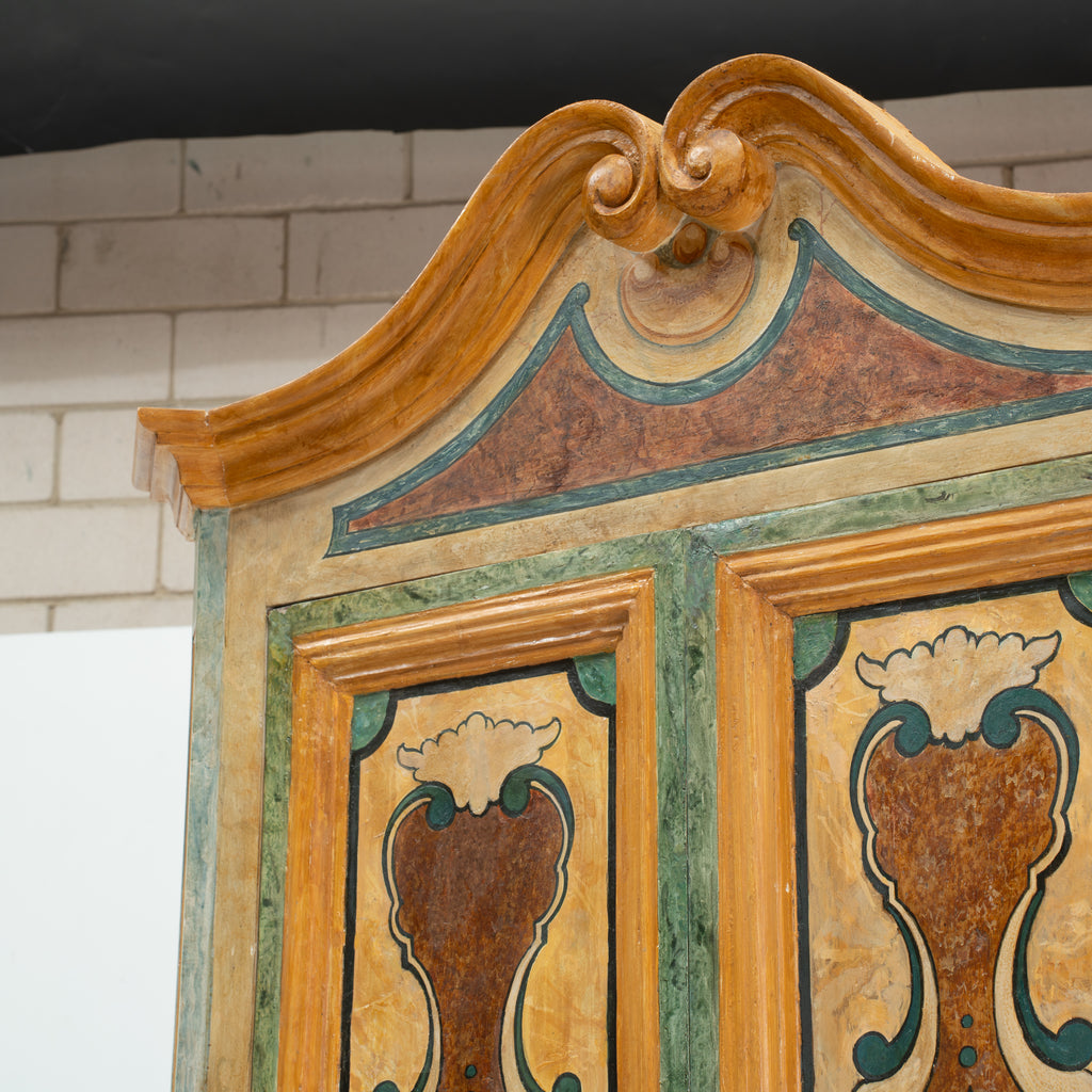 Of two-part form, the upper section surmounted by a shaped broken-arch pediment centred with a carved and gilded scroll finial ; the canted upper case fitted with a pair of doors, each elaborately decorated in polychrome with scrolling cartouche reserves in ochre, sienna, and cream against a marbled sage-green ground, the whole framed by conforming canted pilasters with lozenge and foliate painted ornament; the lower section fitted with two long drawers, each panel decorated en suite with central cartouche motifs in the Baroque manner, flanked by canted stiles continuing the decorative programme; raised on bracket feet of shaped outline.