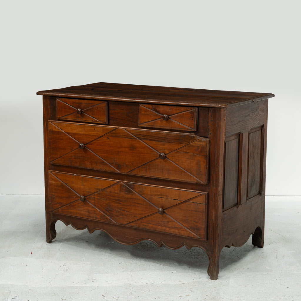 The rectangular top above two short and two long drawer with a diamond cut pattern across the drawer fronts and simple wooden handle, above a shaped apron and with panelled sides