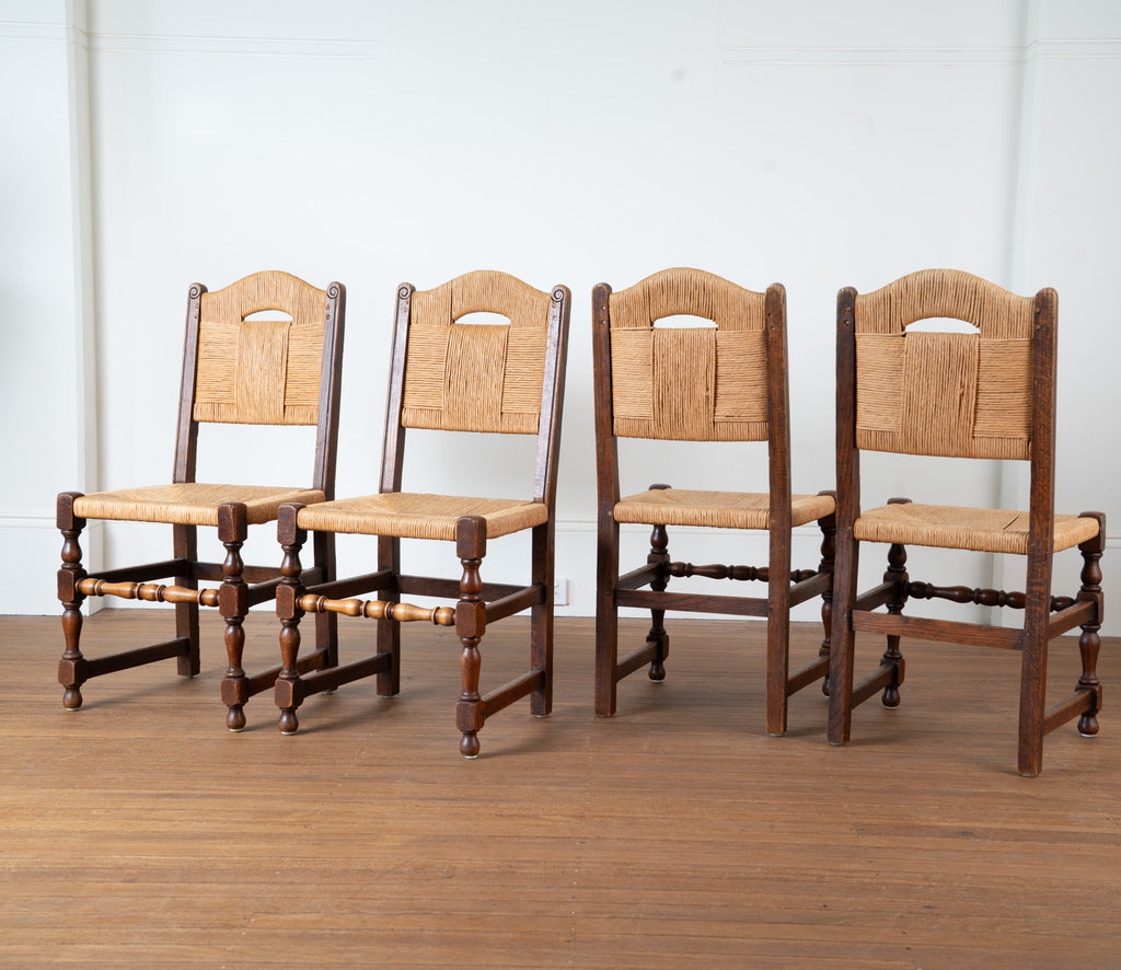 Each chair with a shaped and arched cresting rail carved at either end with a small inward-scrolling volute, above a rush-woven back panel divided by a central vertical oak splat and pierced with a shaped hand-hold aperture of elegant simplicity, above a generous rush-woven seat of tightly worked coiled construction, raised on four turned baluster front legs of compressed, tapering form united by a turned front stretcher and plain flat side and rear stretchers, terminating in ball feet, the whole in darkly stained oak of even, well-developed patina throughout.